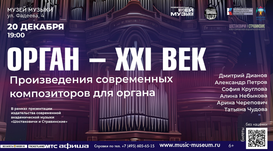 20 декабря в 19.00 в Российском национальном Музее Музыки в рамках презентации издательства современной академической музыки «Шостаковичи и Стравинские» прозвучат произведения современных композиторов для органа.
