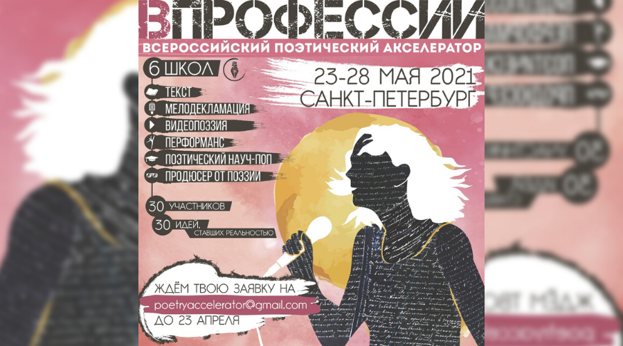 Всероссийский поэтический акселератор «В ПРОФЕССИИ» – это беспрецедентный социальный лифт для русскоязычных поэтов в возрасте от 18 до 35 лет различного уровня профессиональной подготовки. Вас ждёт наставничество признанных мастеров сферы в 6-ти поэтических школах (Текст, Мелодекламация, Видеопоэзия, Перформанс, Поэтический науч-поп, Продюсер от поэзии), путь от идеи до готового медиапродукта длиной в 5 дней.