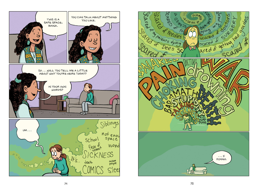 Десять лет назад Райна Тельгемейер (Сан-Франциско, США, 43 года) взбудоражила издательский мир своей книгой об ортодонтии – этой «библейской чуме», обитающей в детских ртах по всему миру. Книга под названием «Улыбка» рассказывала об отчаянии автора из-за потери двух резцов, что буквально пошатнуло вселенское равновесие. Если тебе 11-12 лет, и ты уже начинаешь интересоваться мальчиками, проблема совсем не пустяковая. Успех книги подтолкнул художницу еще раз покопаться в фактах автобиографии, и следующую книгу она посвятила рождению младшей сестры Амары (и всем неприятным переживаниям, которые случаются после этого в жизни старшего ребенка), а еще одну – «Смелость» - страхам и фобиям, которые испытывала с девяти лет.