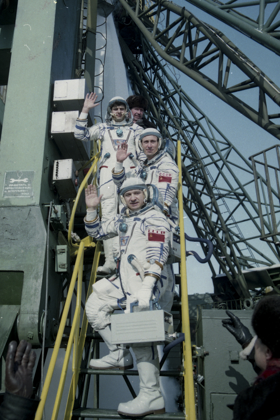 На фото экипаж перед стартом: Леонид Кизим, Олег Атьков, Владимир Соловьев.
