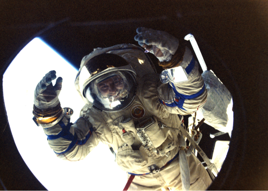 На фото: Владимир Соловьев в открытом космосе, съемка из иллюминатора.