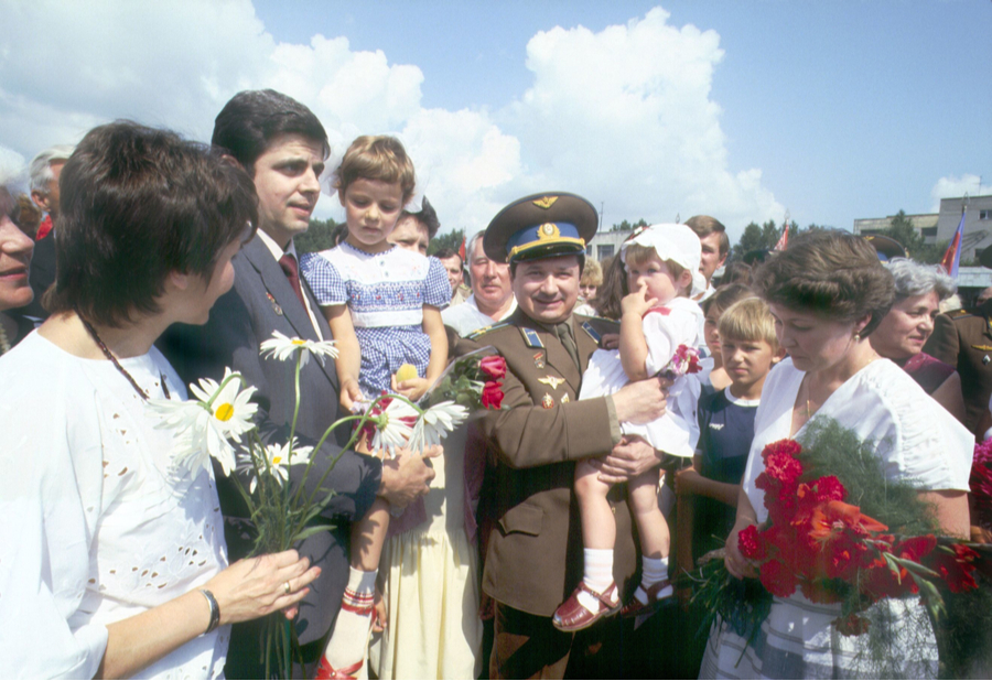 На фото: космонавты Владимир Соловьев и Леонид Кизим с семьями, на руках у Владимира дочь Мария.
