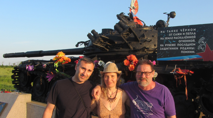 Олег Шухарт, Елена Заславская и Андрей Новиков возле памятника погибшим в 2014 году танкистам. На памятнике стихи Елены Заславской