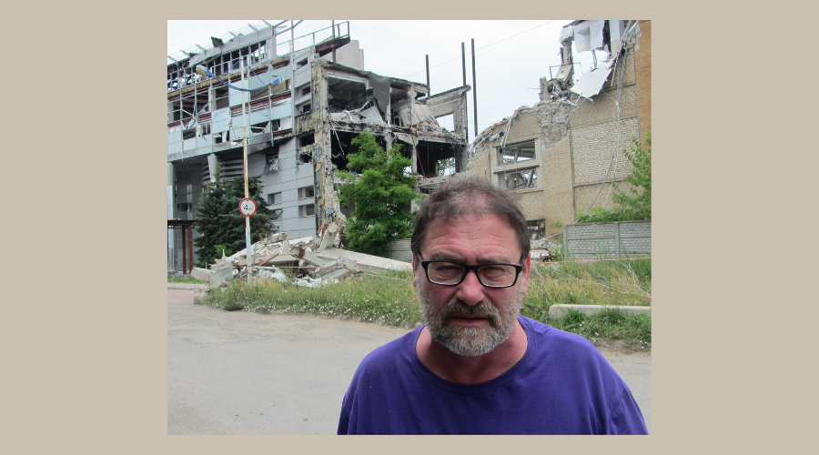 Андрей Новиков у завода «Полипак» (следы разрушений от ракет Storm Shadow)