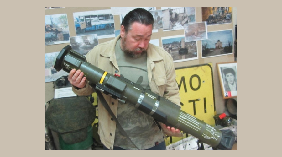 Александр Пономарёв изучает шведский противотанковый гранатомёт (гранатомёт этот, между прочим, из Азовстали)