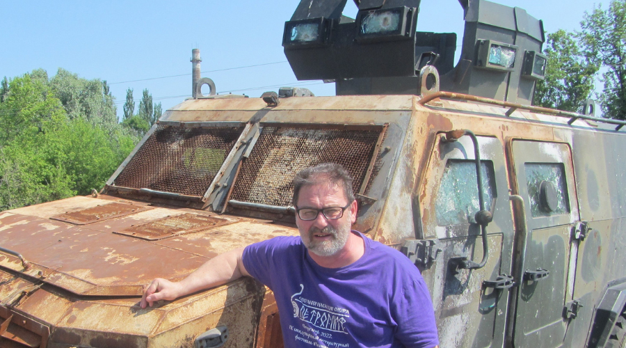 Андрей Новиков возле сгоревшего бронетранспортера и танков ВСУ