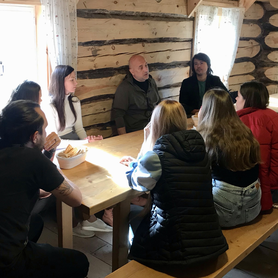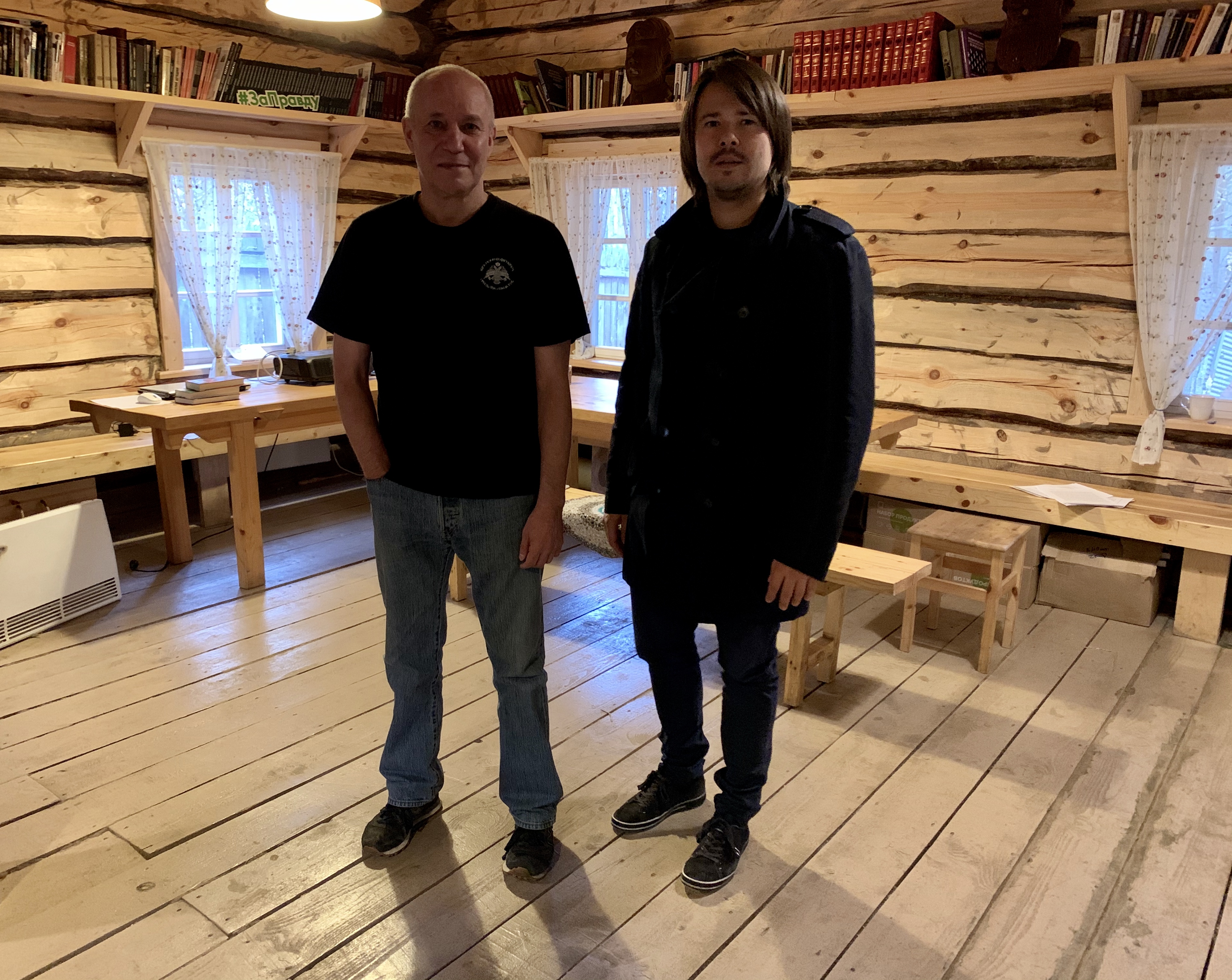 Занятия проходили на Хуторе в подмосковном Лапино, в низине у леса на берегу реки Медвенка. У входа в избу клетка с огромным вороном, встречающим гостей, а внутри хозяйка-кошка, широкие лавки, столы, полати под потолком, на которых книги в ряд и бюсты Толстого, Есенина и Маяковского. А еще в избе есть настоящая русская печь, которая согревала нас, наполняя пространство теплом и приятным звуком дровяного потрескивания.