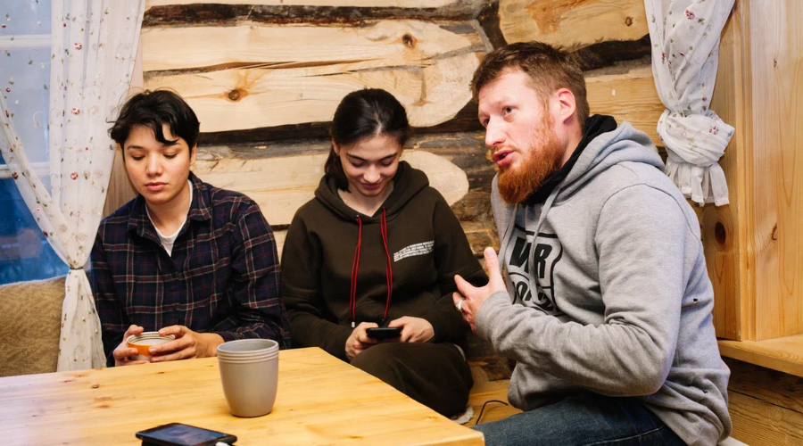Занятия начинаются в десять утра, заканчиваются после захода Солнца – в 8-9 вечера. На завтрак обычно Алексей Колобродов жарит яичницу, обед и ужин готовит не он, но обязательно рассыпает еду по тарелкам и выдаёт порции. Живут все в номерах по 4-5 человек, слышимость хорошая, поэтому если у кого-то на этаже случайно звонит будильник в 7 утра, просыпаются все.
