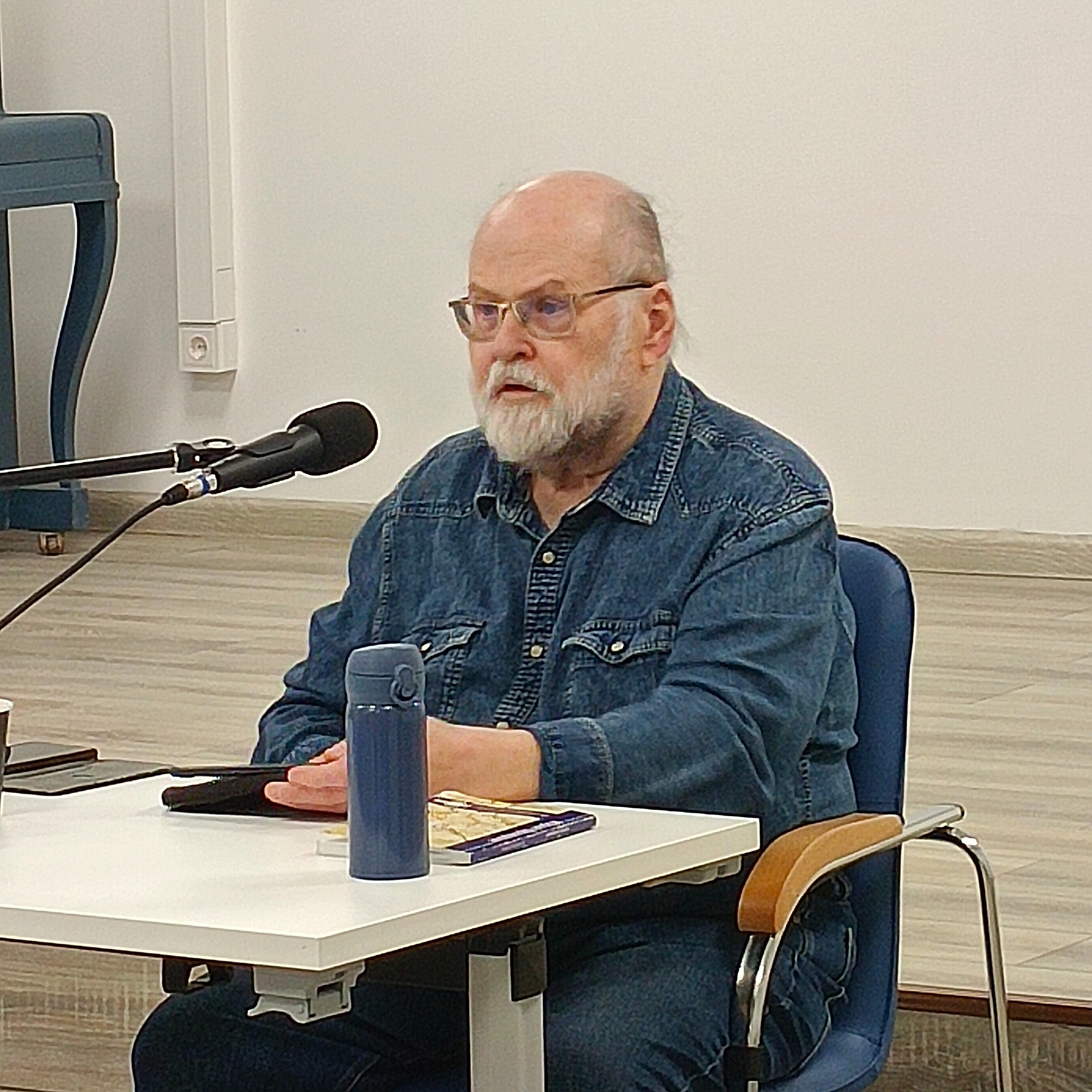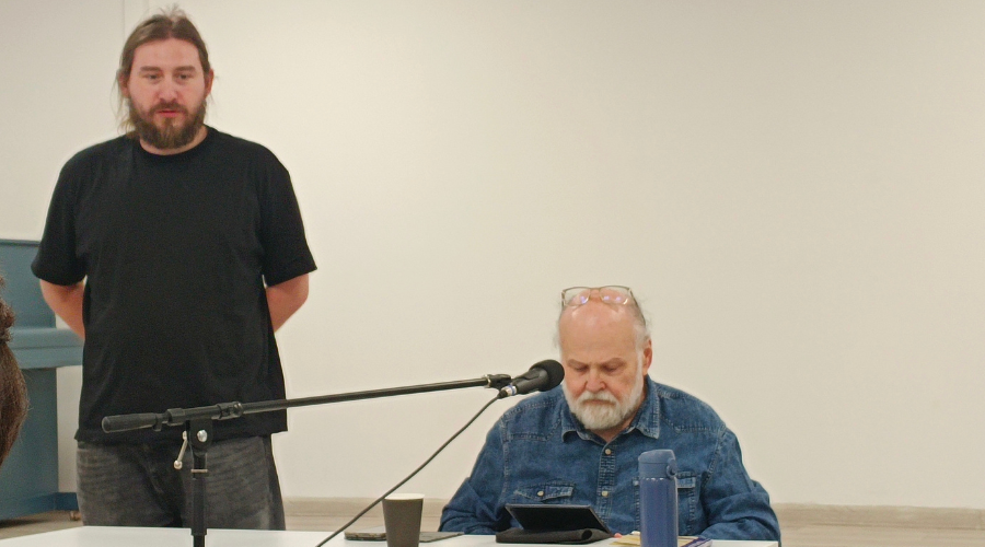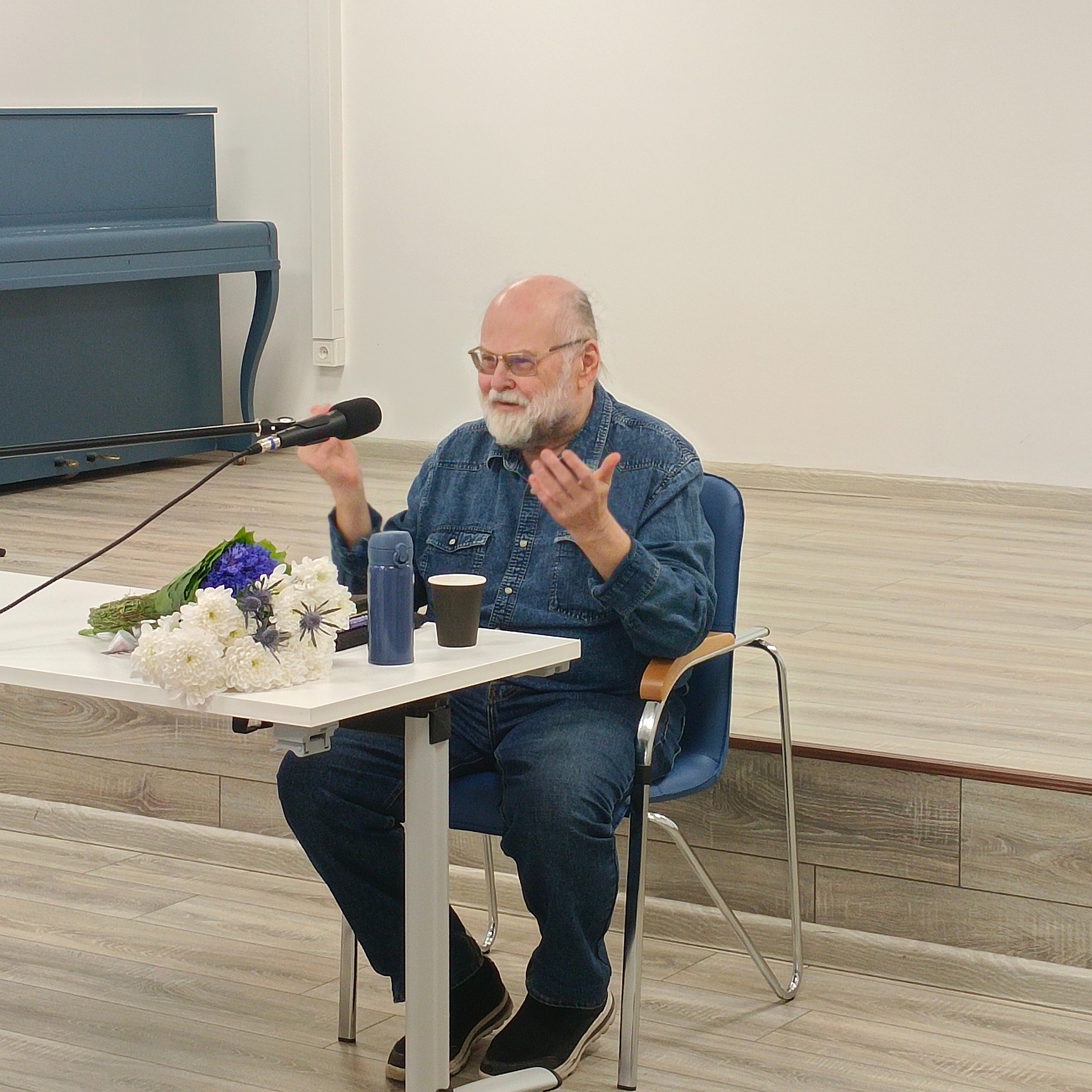 Прозвучал вопрос из зала о том, какой это стиль, жанр — его стихи. «Необычный», по словам слушательницы.