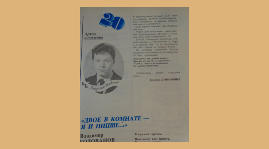 Борис Кутенков: Пока ты ищешь, я скажу немного о Голованове – это ученик Евгения Бунимовича. Ученик в буквальном смысле – он учился в школе, где Бунимович преподавал. После его смерти Евгений Абрамович опубликовал Голованова в журнале «Юность», это единственная публикация, и мы задаёмся вопросом: сколько же людей, которым так не «повезло» (в трагиироническом смысле), у которых не было такого учителя, как Евгений Бунимович, и их творчество сгинуло безвозвратно.