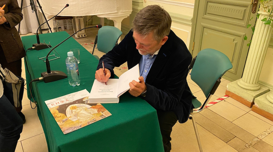 И.А. Есаулов подписывает экземпляр книги «Пасхальность русской словесности»