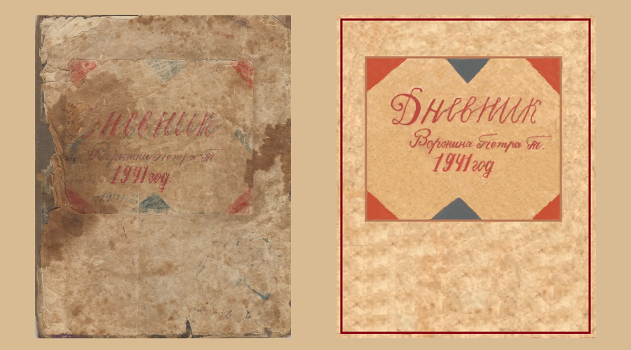 Исходная и частично восстановленная лицевая обложка дневника Петра Воронина