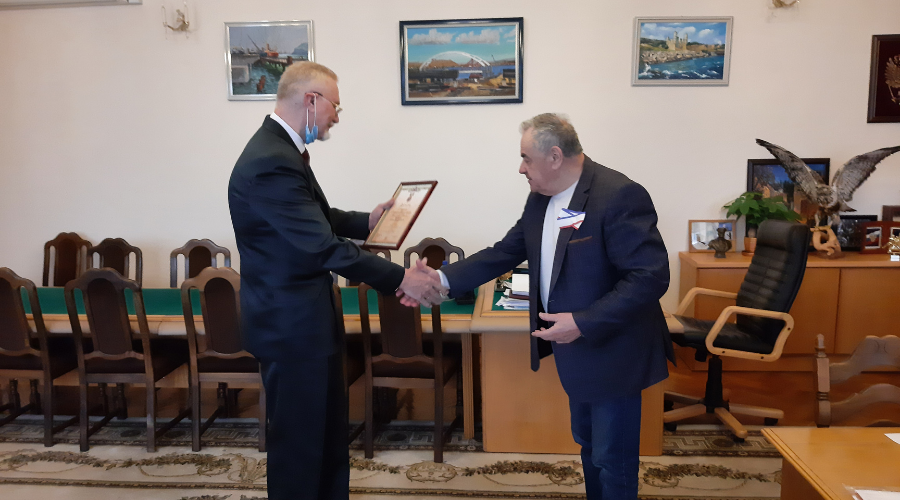 На фото: вручение Государственной премии Республики Крым А. Воронцову (слева) первым замесителем Госсовета РК Е.З. Фиксом, Симферополь, 20.01.2022