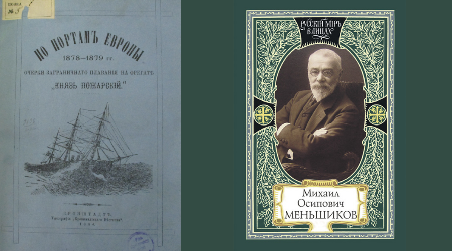 На фото: разворот книги М.О. Меньшикова «По портам Европы. 1878–1879. Очерки заграничного плавания на фрегате «Князь Пожарский»» (Кронштадт, 1884) и обложка книги А.В. Воронцова «Михаил Осипович Меньшиков»