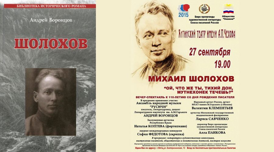 На фото: обложка книги А.В. Воронцова «Шолохов» и афиша вечера-спектакля к 110-летию со дня рождения М.А. Шолохова