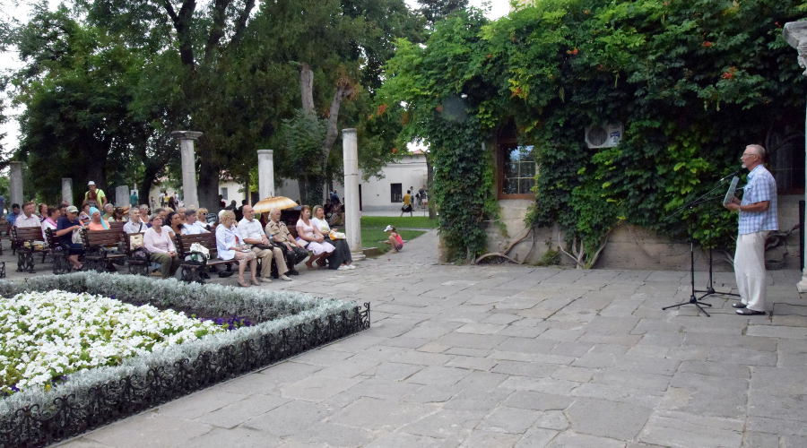На фото: презентация книги о М.О. Меньшикове в Итальянском дворике крымского Херсонеса, 27.08.2018