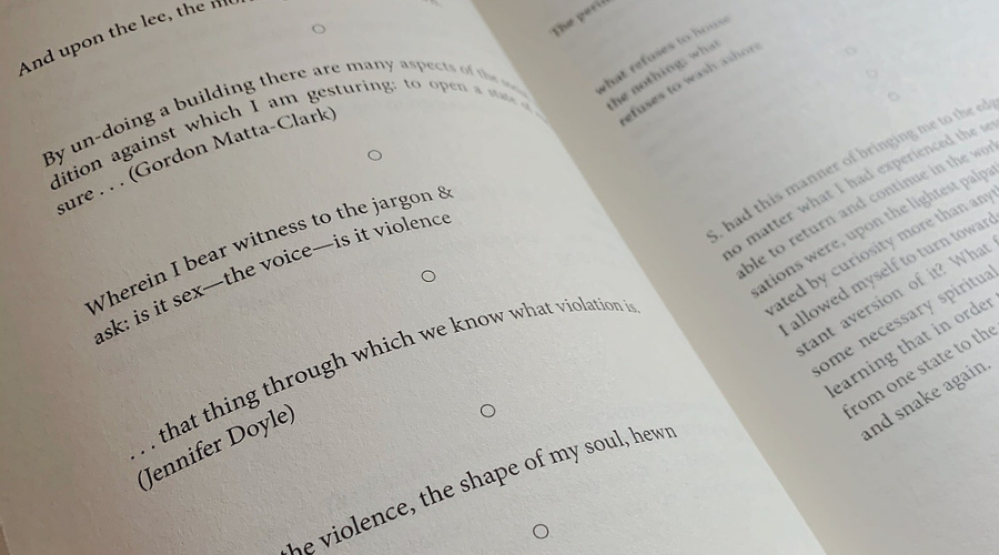 Круги помогают выразить центральную тему сборника: отсутствие – это присутствие, а не место – место? Стэнфордская энциклопедия философии отмечает, что дыры являются «интересным примером в онтологии и эпистемологии», поскольку «мы часто обращаемся к дырам для объяснения причинности и взаимодействия», и все же дыры, строго говоря, не являются материальными объектами. «Нигде не существует, не место, – пишет Монтес в стихотворении. – Это модуляция». Позже упоминает то же в прозе: «Когда я жила в двух местах одновременно (Миннесота и Нью-Йорк), то чувствовала, будто я нигде не живу, потому что никто не знал точно, где я нахожусь». И снова в стихотворении: «Что, если не существует места, где можно жить», «Что, если ничего нет? Что, если нет?» Круги обозначают границы между фрагментами текста. Эти фрагменты взаимосвязаны, а с другой стороны – не совсем. Если на месте дыры поместить знак «дыра», она уже не будет пустой. Похоже на страницу юридического документа, где написано «Эта страница намеренно оставлена пустой», когда страница перестает быть пустой. У Монтес эти знаки говорят: не пропускайте пробелы – промежутки в тексте тоже являются частью текста.