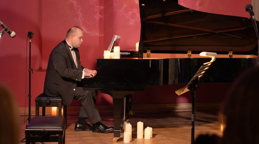 Как признался следующий герой концерта, Илья Кузнецов, в своей Большой концертной фантазии F-dur он стремился к созданию жизнерадостной музыки. И композитору это, безусловно, удалось. Исполненное автором произведение было полно воодушевления и энергичной устремленности, в его фактурно-гармоническом строе прослушивалось родство с красочной сферой в духе ярких голливудских музыкальных композиций 60-70 – х годов XX века. Хотя и нашлось место напряженным эпизодам – в средней части произведения присутствовали фрагменты, отмеченные сосредоточенно-минорным строем и острой скерцозностью. В целом же можно порадоваться, что есть авторы, намеренно пишущие жизнеутверждающие по своему замыслу сочинения, и это вполне оправдано – заключительные аккорды произведения, которые захлестнули публику как брызги шампанского, сорвали многочисленные овации слушателей.