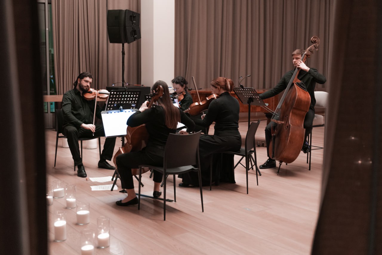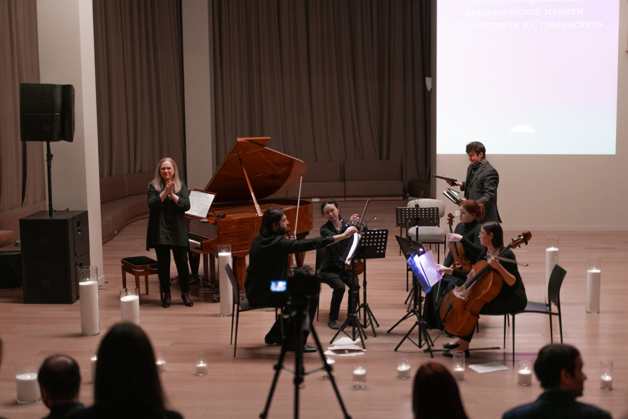 Современный лаконичный дизайн, зал, уходящий амфитеатром вверх, панорамные окна и завораживающее мерцание свечей в стеклянных колбах разного размера были призваны создать особое настроение для особенного концерта. Концерт, состоящий исключительно из квартетов и квинтетов, отсылает нас к традиции домашнего или салонного музицирования. Квартет предстает как личное высказывание композитора, адресованное близким и друзьям, именно такое ощущение интимности царило на концерте, где прозвучали совершенно разные высказывания современных авторов.