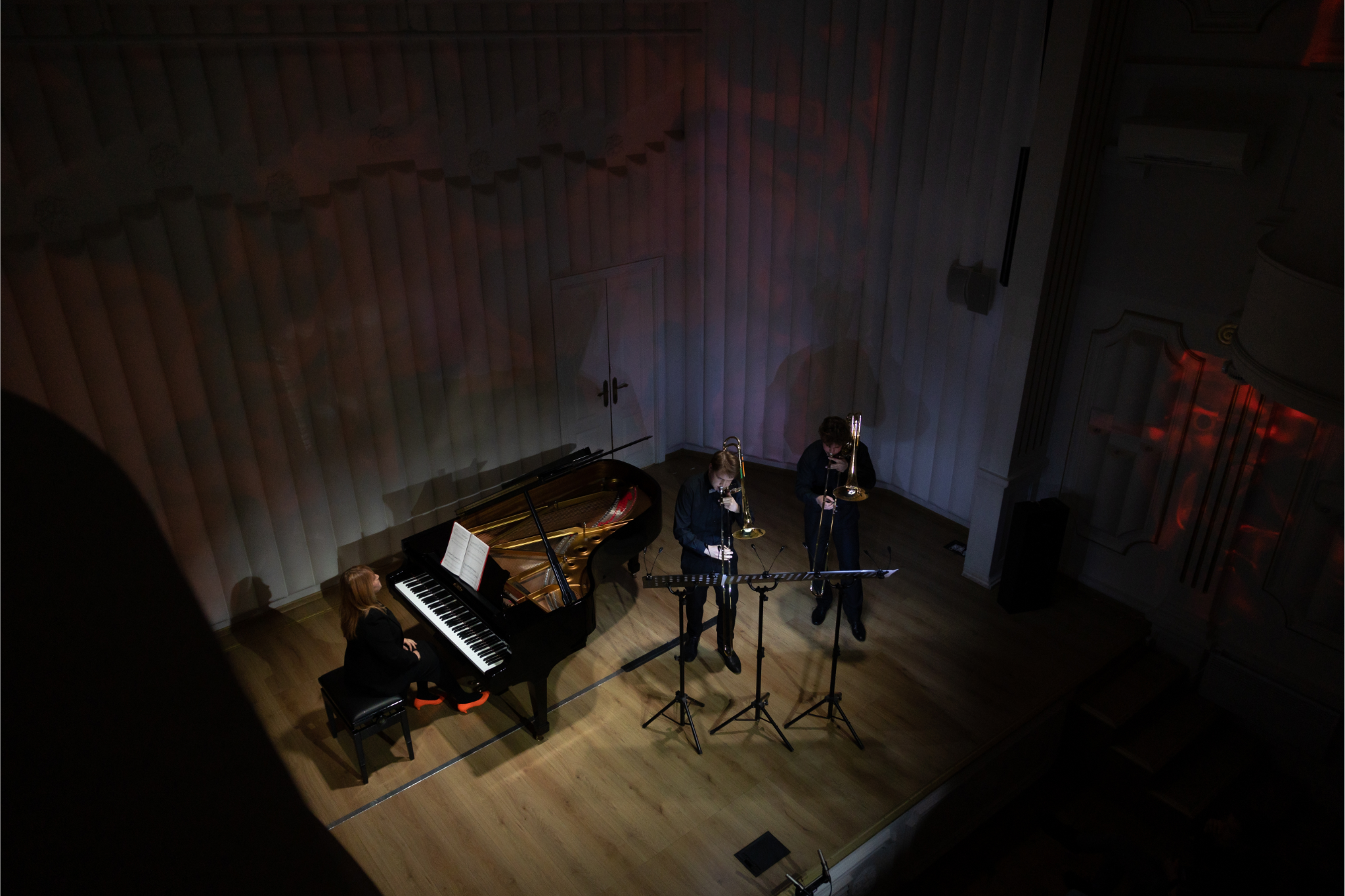 Композитор Жанна Габова (фортепиано), Тамаш Ковач (бас-тромбон), Матвей Негруль (тенор-тромбон)