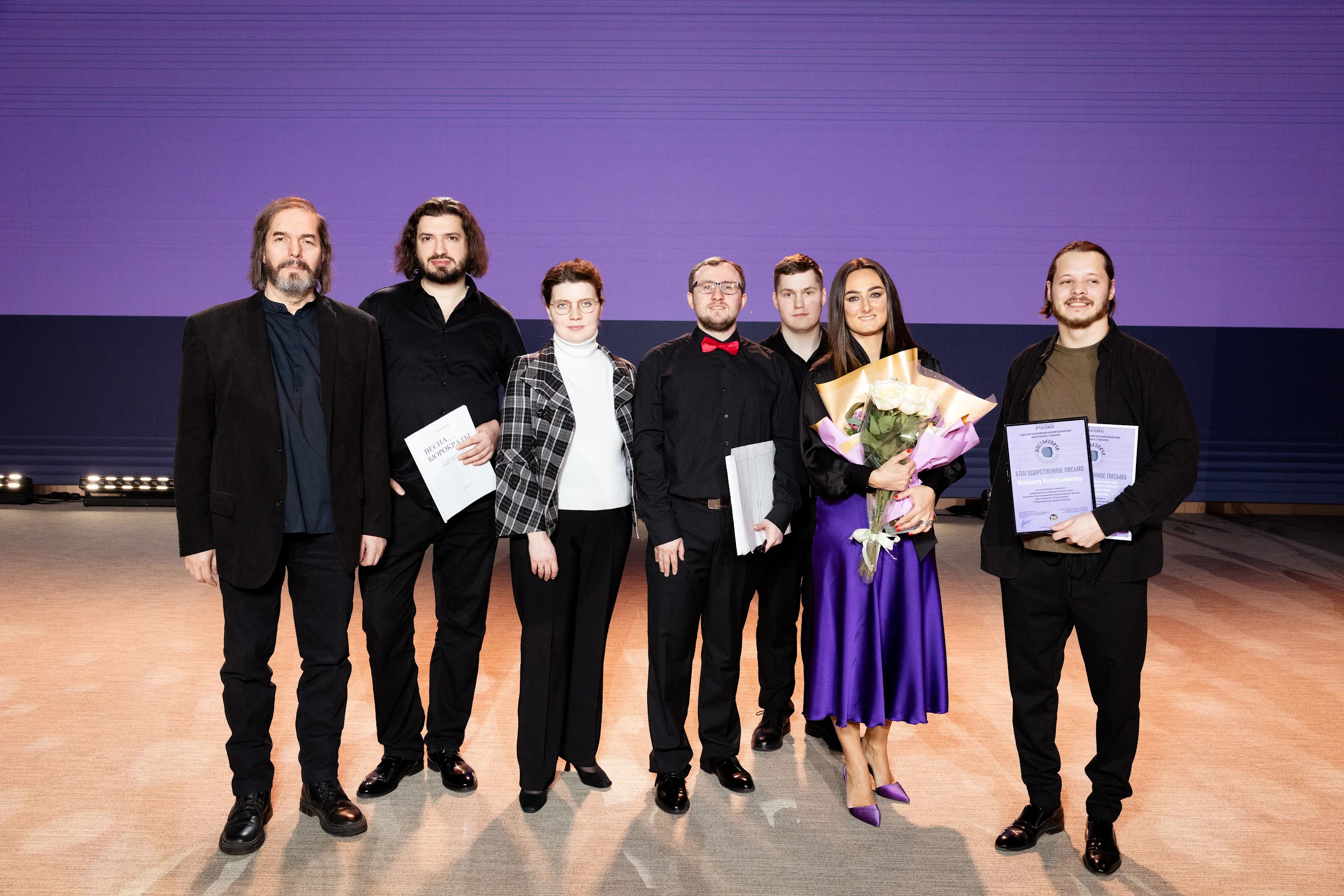 Композитор Тарас Буевский, дирижер Павел Солдатиков, композитор Любовь Шангина, дирижер Евгений Рубцов, композиторы Никита Воронцов, Алина Небыкова и Михаил Котельников