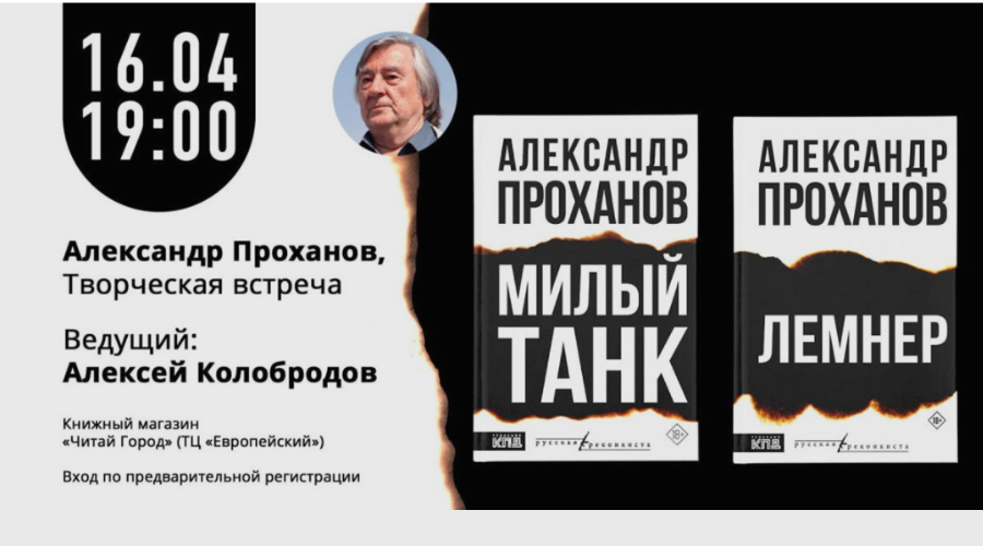 На встрече состоится беседа о романах Александра Проханова «Милый танк» и «Лемнер», анонсирована новая авторская серия «Планета Проханов». Вход по регистрации.