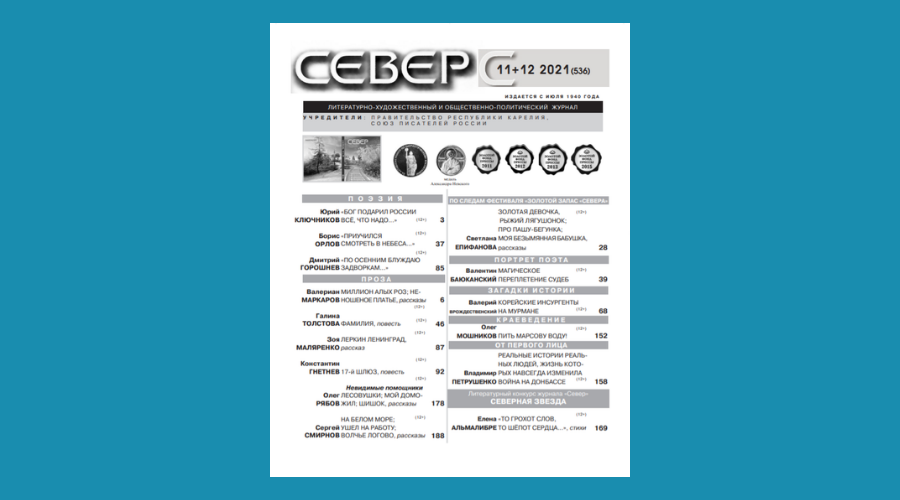 «Север» – академический журнал умеренно консервативной направленности. Тематическое поле 11-12-ого выпусков «Севера» за нынешний год – это частная жизнь современных россиян в условиях современной среды обитания и на фоне исторического прошлого страны. Показательны публикации Юрия Ключникова «Бог подарил России всё, что надо...», Галины Толстовой «Фамилия», Сергея Псарева «Среди берез» и др.