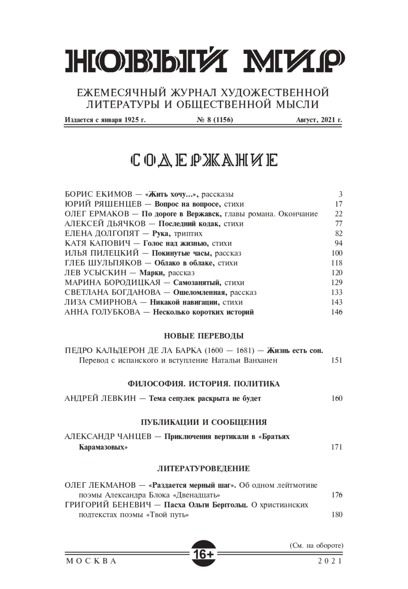 Пожалуй, знаком качества журнального номера может быть то, что в нём невозможно выбрать лучшую публикацию. Если судить так, то августовский «Новый мир» получился хорошим.